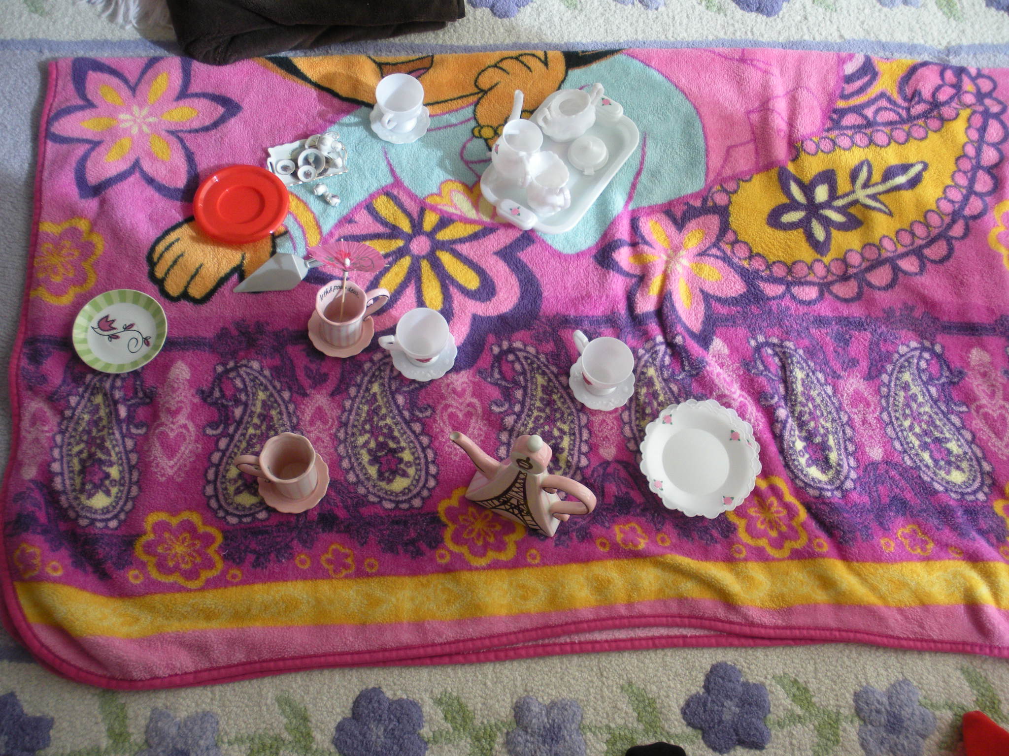 So our quality time continued. We had a tea party on our finest Dora blanket: