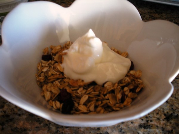 Ali felt pretty daring this morning and ventured away from his usual bowl of morning oatmeal to join me in eating some granola topped with Oikos plain 0% yogurt.  Separate spoons were involved, of course.
