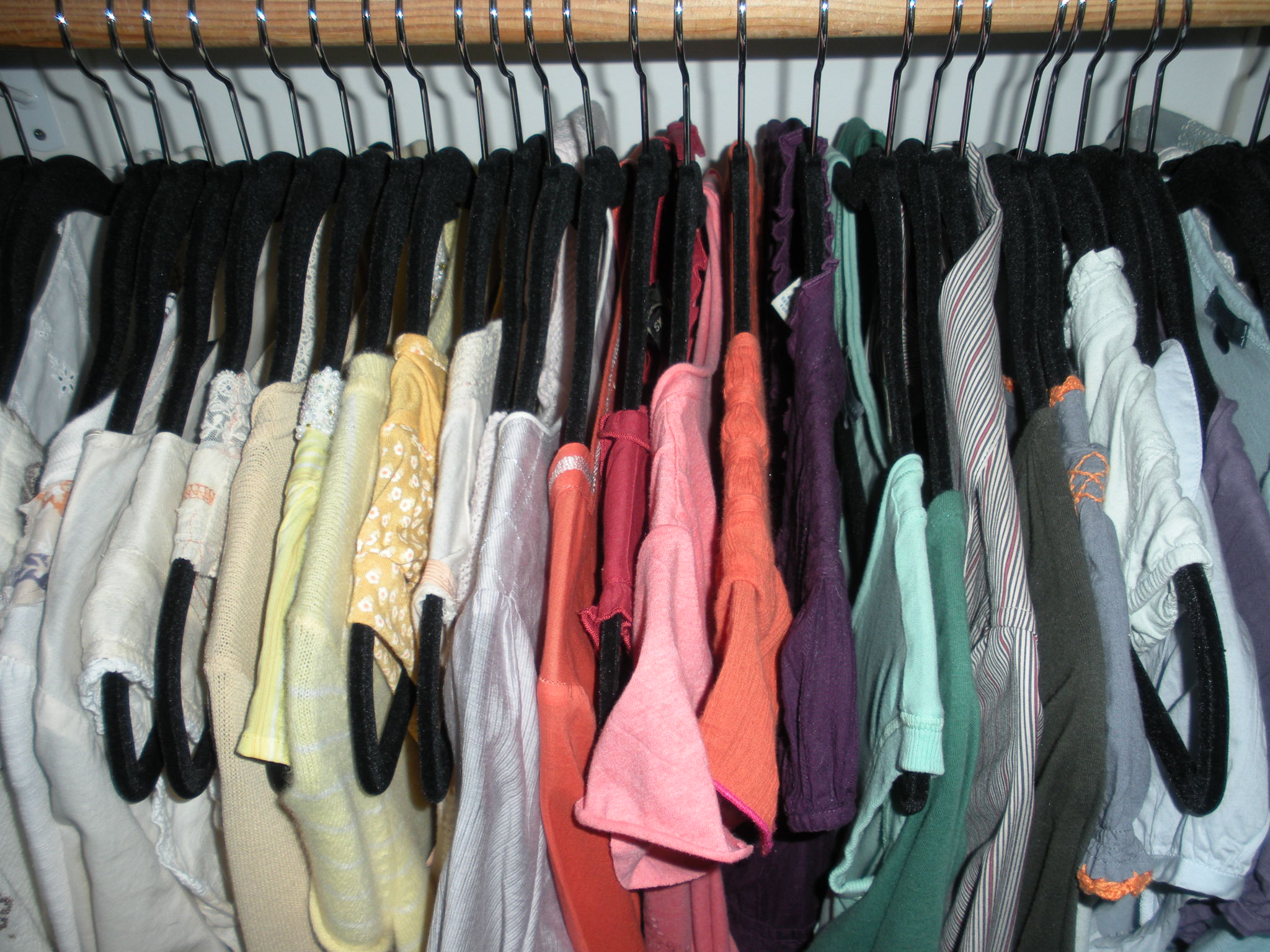 The Good – Maya kept busy in the bathtub for 40 minutes so I could organize a few of my shirts in rainbow order, on my new velvet hangers: