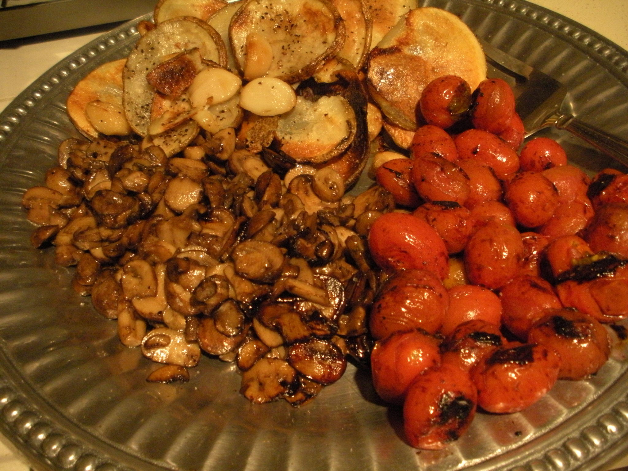 Oh my, that looks like the most delicious meal ever. That meal is right up my alley. I have an incredible love for sauteed mushrooms, potatoes of any kind, and salmon. Yum. The skewers look great too.