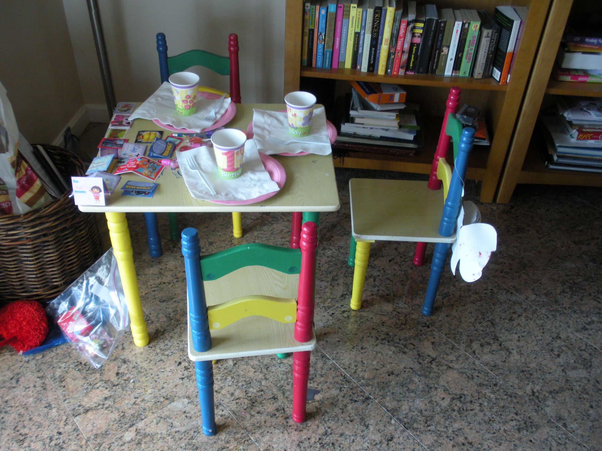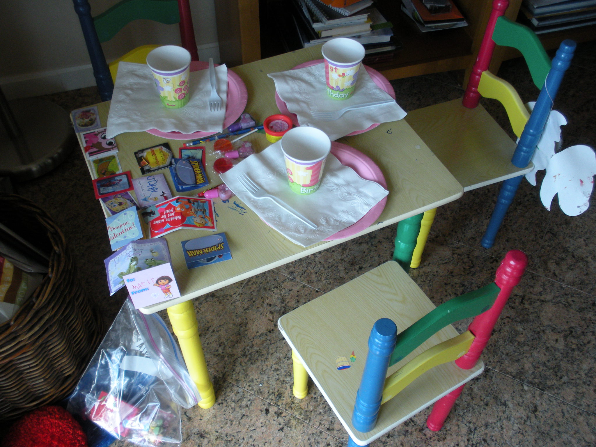 I thought my tablescape was pretty impressive until I saw how nicely Maya had set her own table for her friends, complete with paper plates, plastic cutlery, napkins, paper cups, and Valentine’s Day cards for decoration. Considering that the cups say “1st Birthday” on them, I just hope that Maya had the foresight to dust them off before her friends used them.