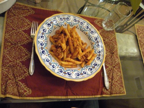 I made a few of my brother’s favorites, including date muffins and pasta with a ground turkey-tomato sauce…