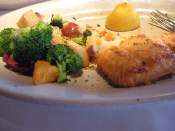 Cedar plank roasted salmon with roasted seasonal vegetables.