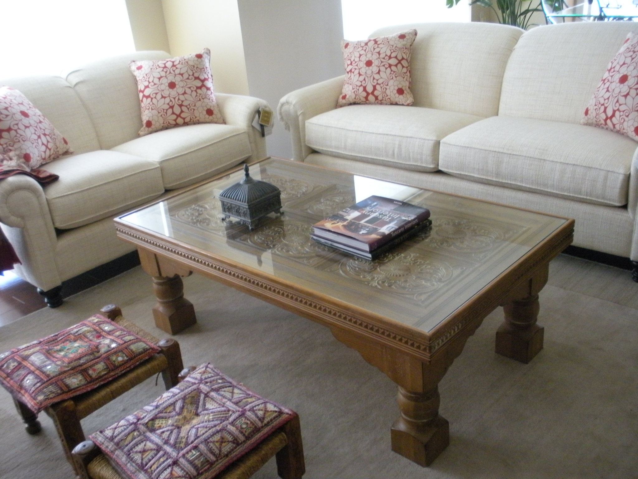 Beautiful new couch. You’ve got good taste in furniture. Those mini stools are so cute.