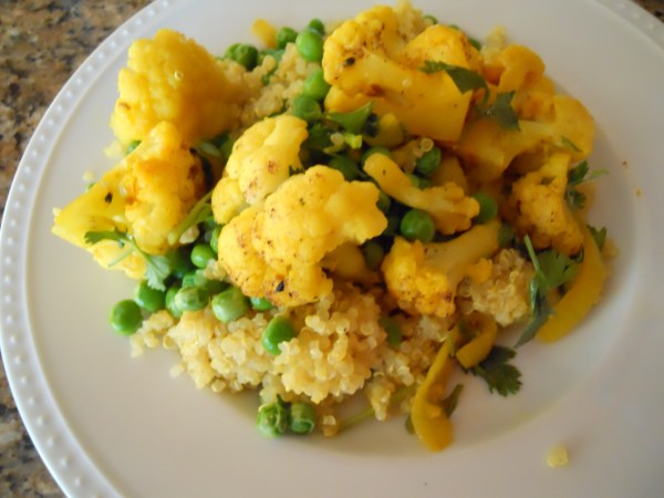 I served this over a quinoa-peas combination instead of rice (which would be just as good).  Cook 1 cup of quinoa according to the directions (it cooks like rice).  While the quinoa is simmering add 1/2 teaspoon of turmeric and 1/2 cup of frozen peas.