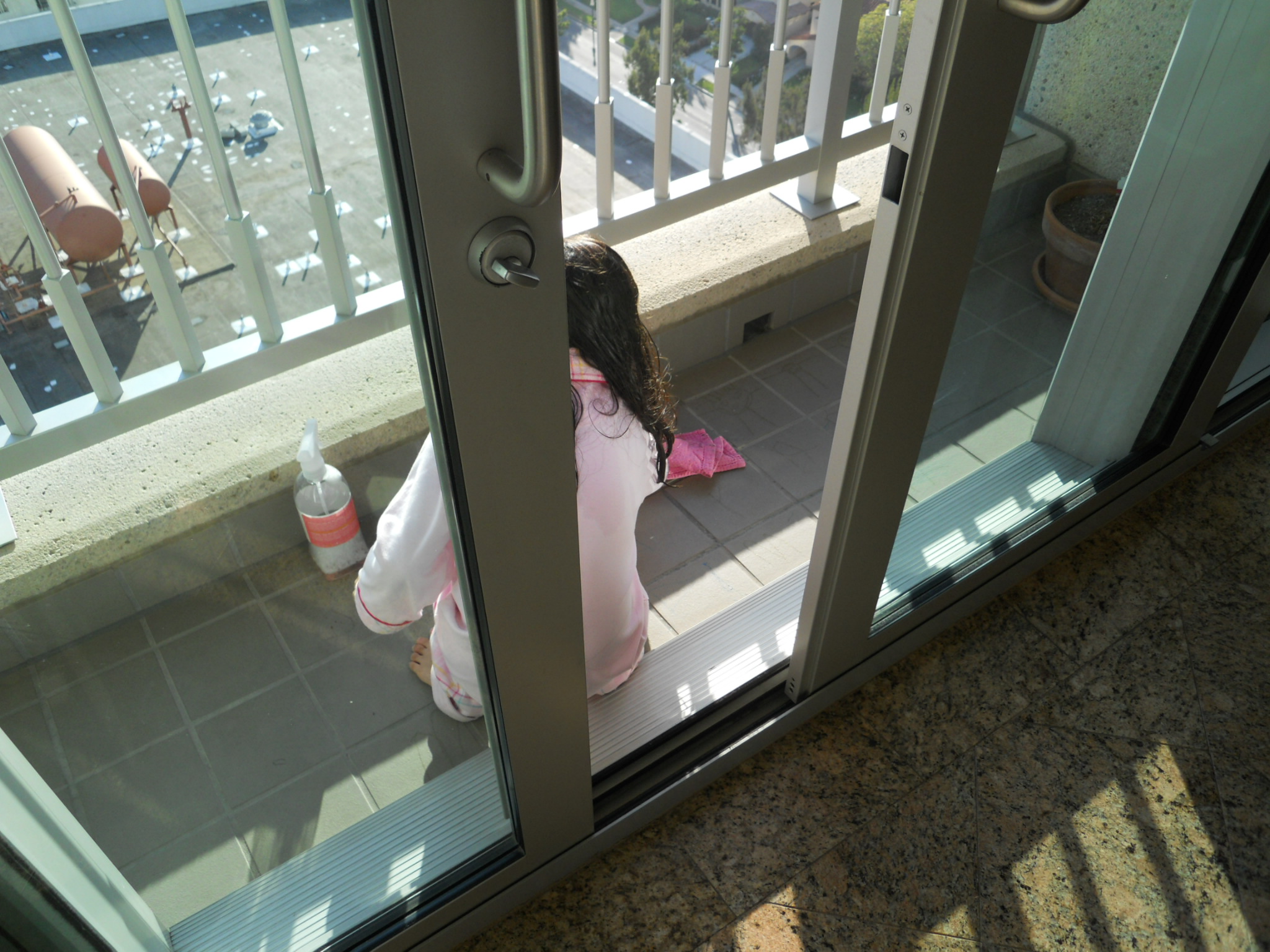 So I did what any other sane mother would do…I handed Picasso toxic chemicals and made her step out unattended on the balcony so she could scrub the floor on her hands and knees.