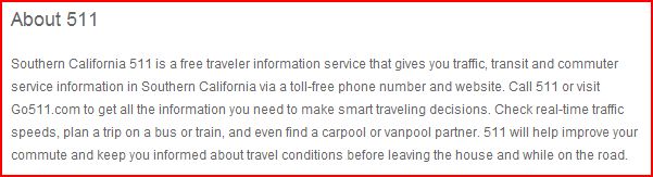 For those of you lucky enough not to live in Los Angeles, we have recently been inundated with ads for the new traffic service 511.  From their website http://go511.com/: