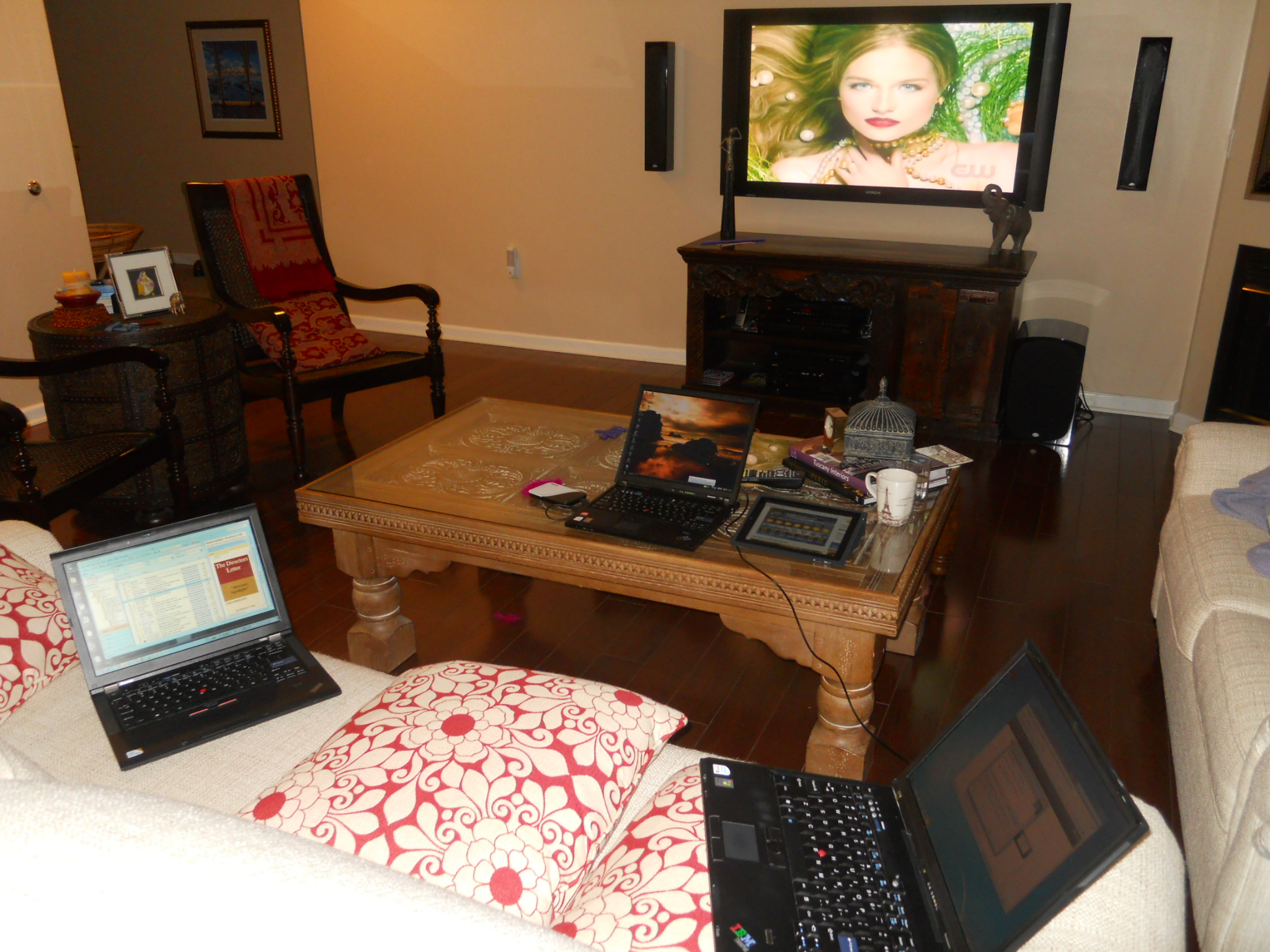 A "Must Fix Ameena's Laptop Command Center" consisting of 3 laptops, an iPad, the much-hated Netbook, a backup drive, and a side of "America's Next Top Model."