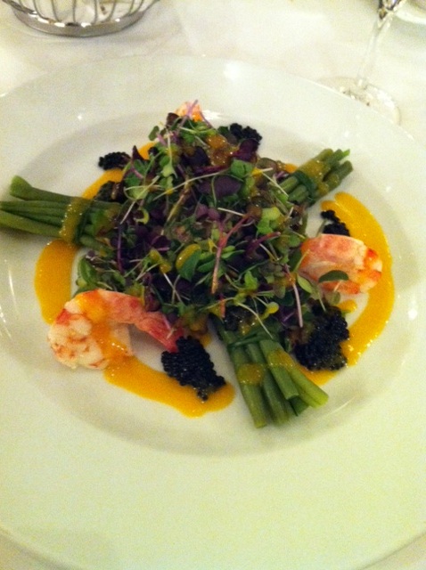 Shrimp, caviar, and mango salad at La Rotonda in Madrid. I will never acquire a taste for caviar.
